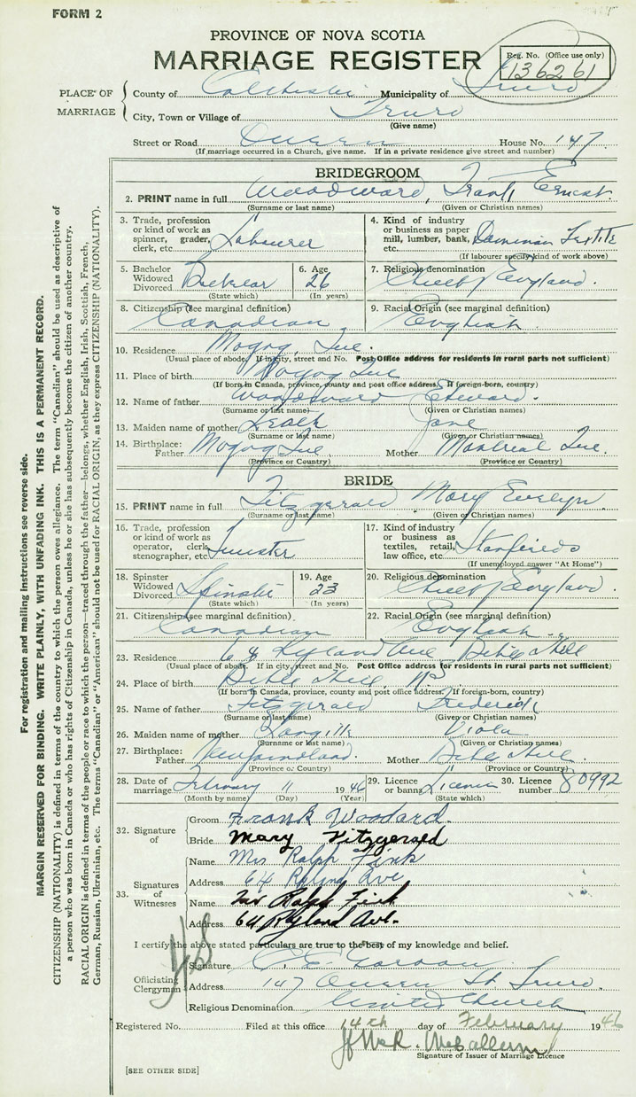 28. Date of marriage February 11 1946 29. By license or banns License 30. License number 80992