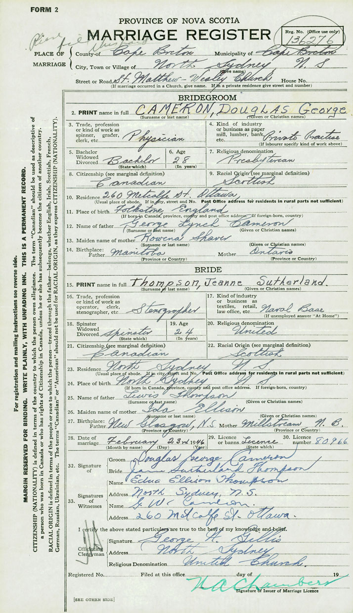 28. Date of marriage February 23 1946 29. By license or banns License 30. License number 80966