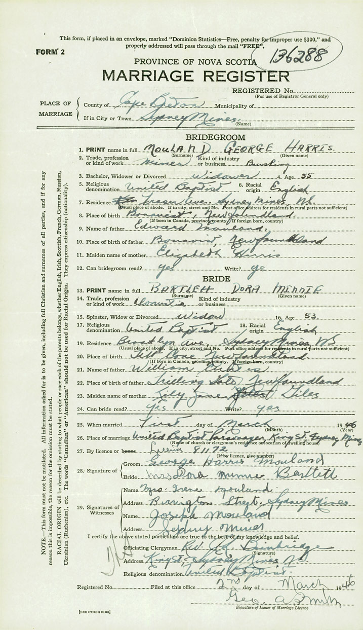PLACE OF MARRIAGE County of Cape Breton in City or Town Sydney Mines