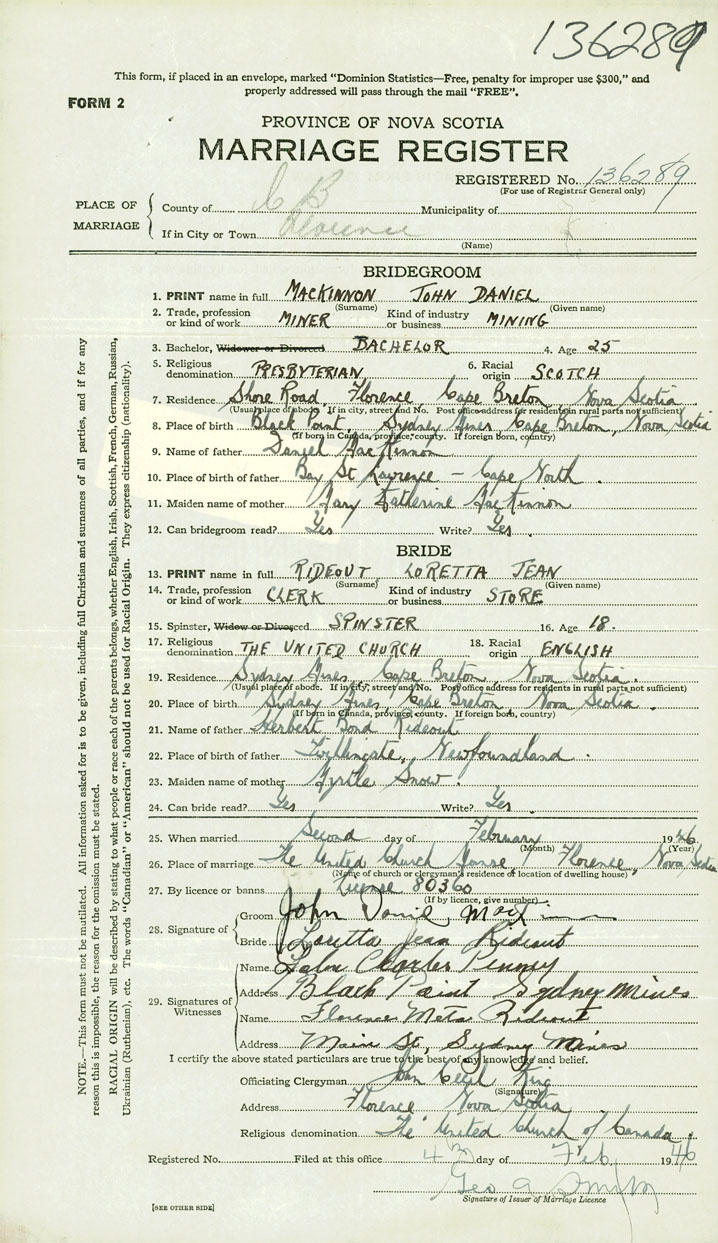 PLACE OF MARRIAGE County of Cape Breton in City or Town Florence
