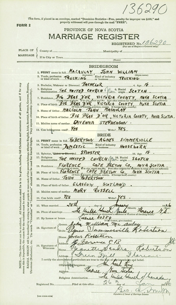 26. Place of marriage The United Church Manse Florence, Cape Breton County