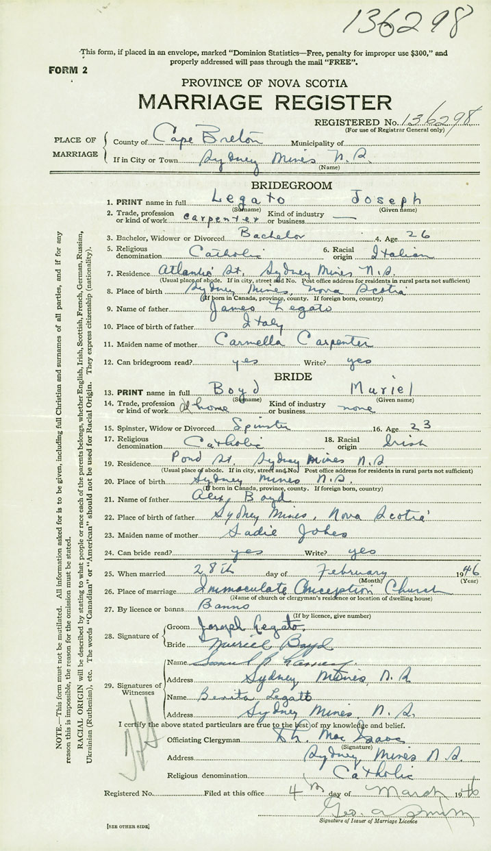 26. Place of marriage Immaculate Conception Church Sydney Mines, Cape Breton County