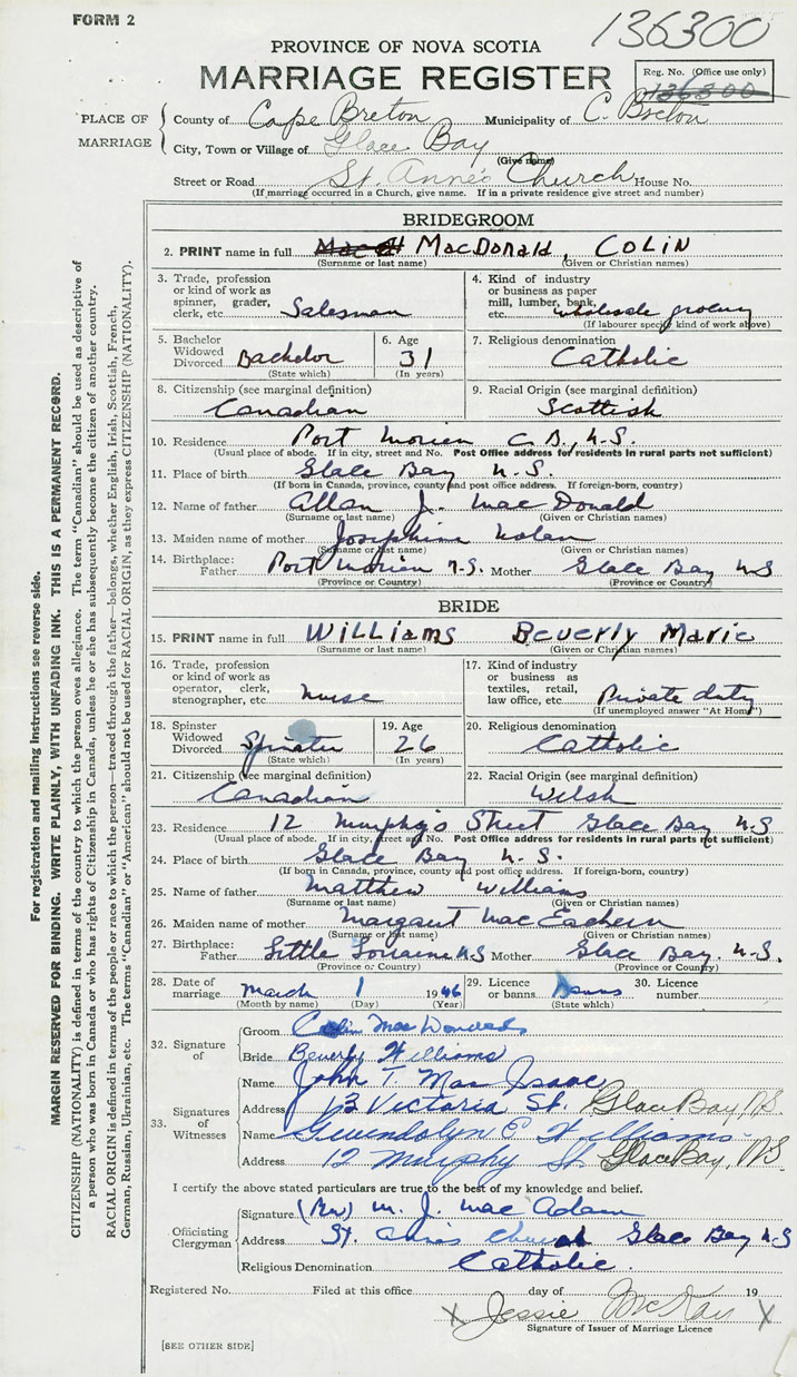 28. Date of marriage March 1 1946 29. By license or banns License 30. License number