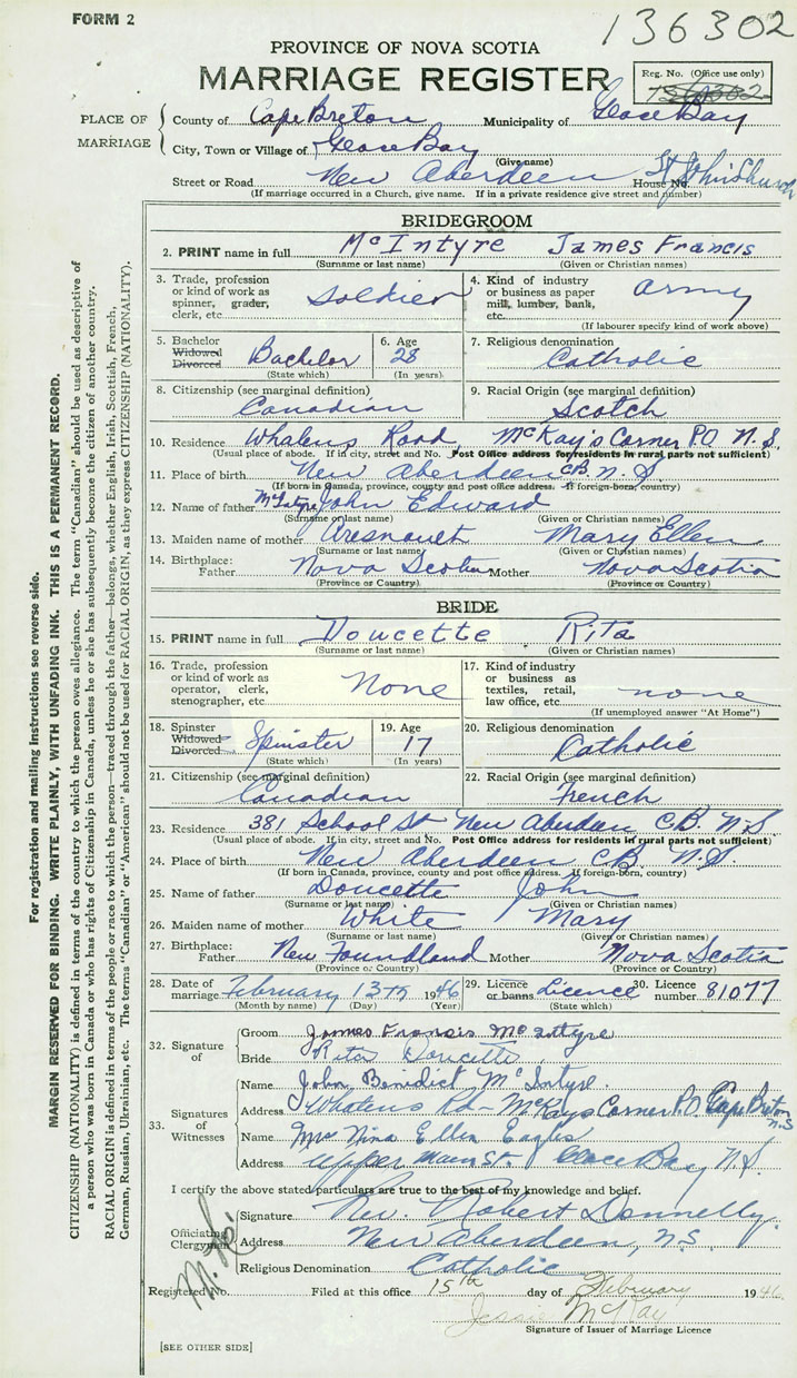 28. Date of marriage February 13 1946 29. By license or banns License 30. License number 81077