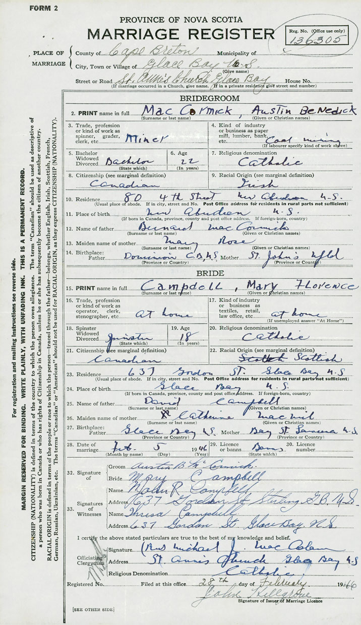 28. Date of marriage February 5 1946 29. By license or banns License 30. License number