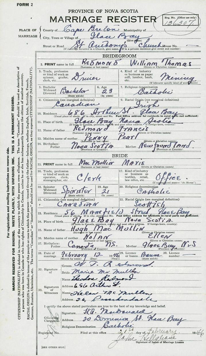 28. Date of marriage February 12 1946 29. By license or banns License 30. License number
