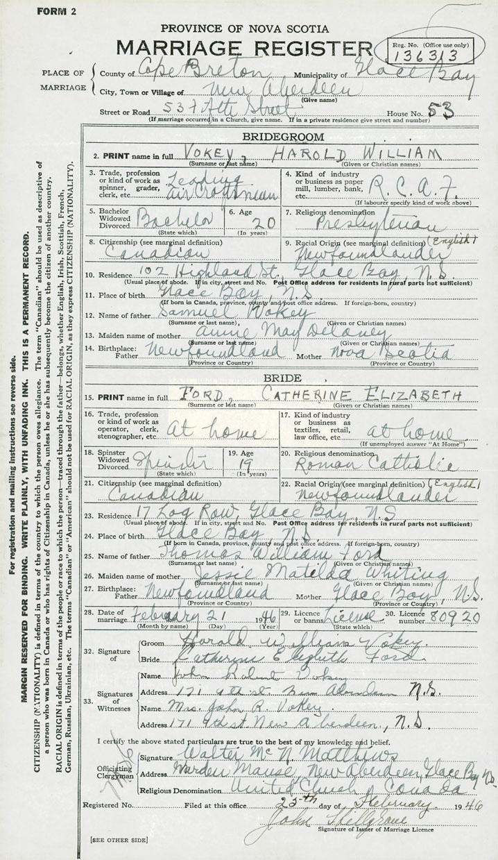 28. Date of marriage February 21 1946 29. By license or banns License 30. License number 80920