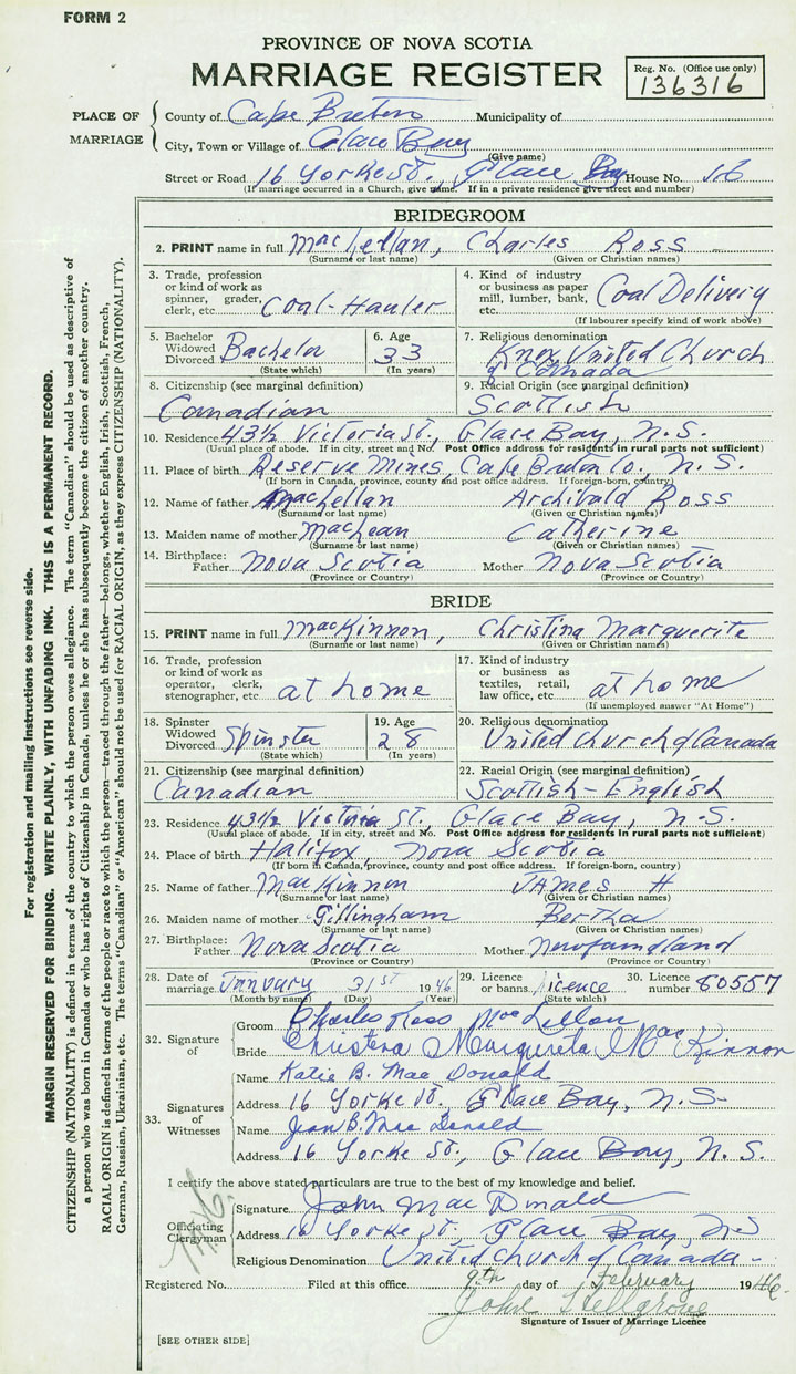 28. Date of marriage January 31 1946 29. By license or banns License 30. License number 80557