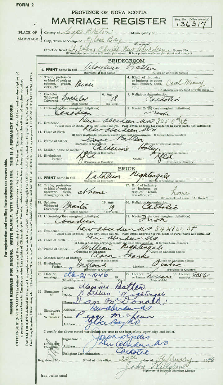 28. Date of marriage February 21 1946 29. By license or banns License 30. License number 80561