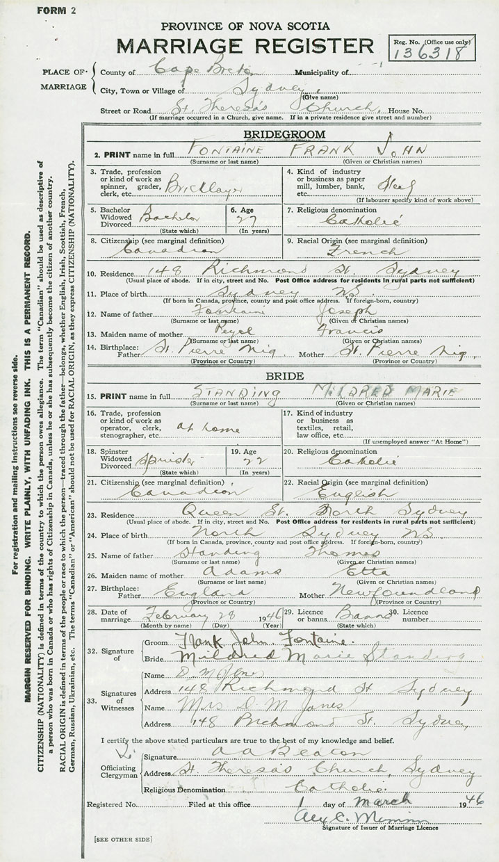 28. Date of marriage February 28 1946 29. By license or banns License 30. License number