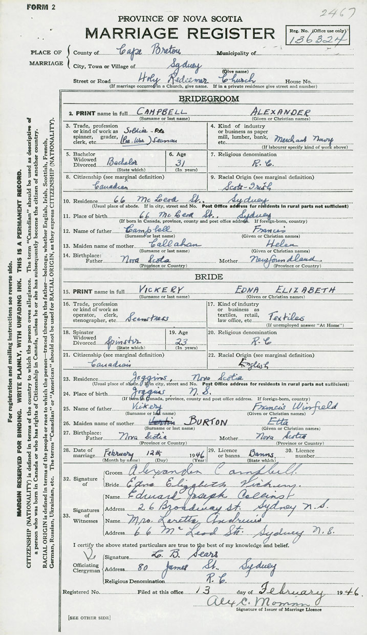 28. Date of marriage February 12 1946 29. By license or banns License 30. License number