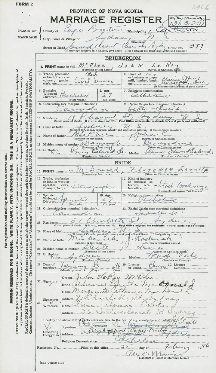 28. Date of marriage February 23 1946 29. By license or banns License 30. License number