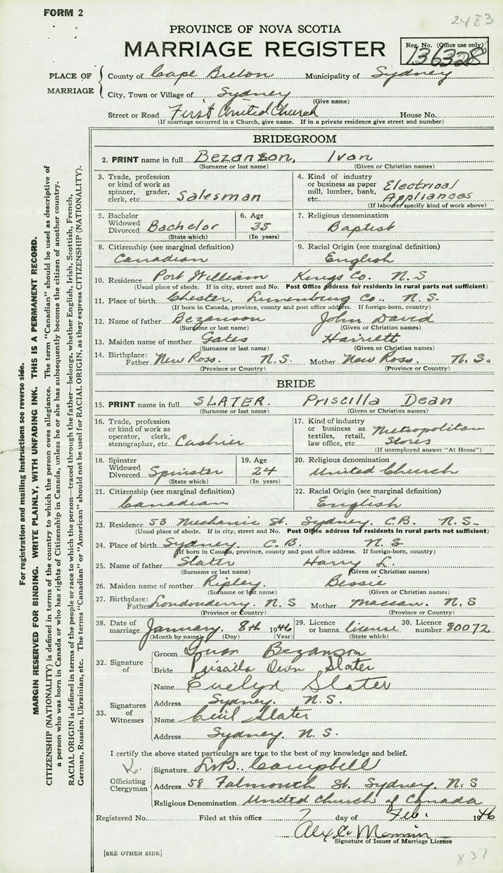 28. Date of marriage January 8 1946 29. By license or banns License 30. License number 80072