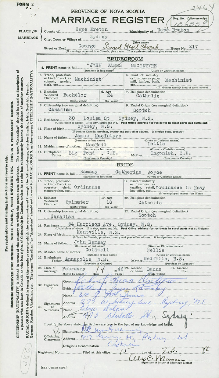 14. Birthplace Father Big Pond, Cape Breton County Mother Ingonish, Victoria County