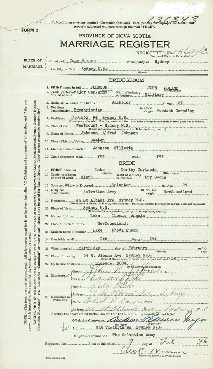26. Place of marriage 44 St. Albans Ave. Sydney, Cape Breton County