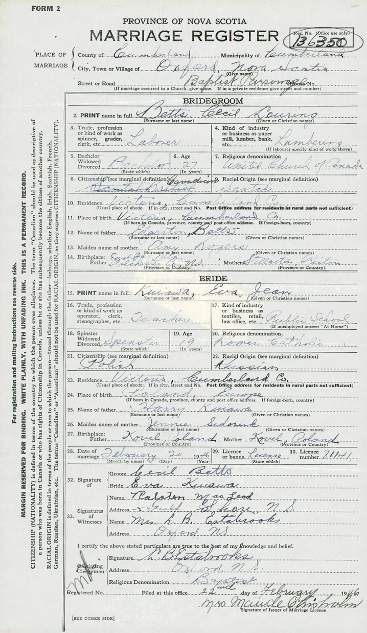28. Date of marriage February 20 1946 29. By license or banns License 30. License number 81141