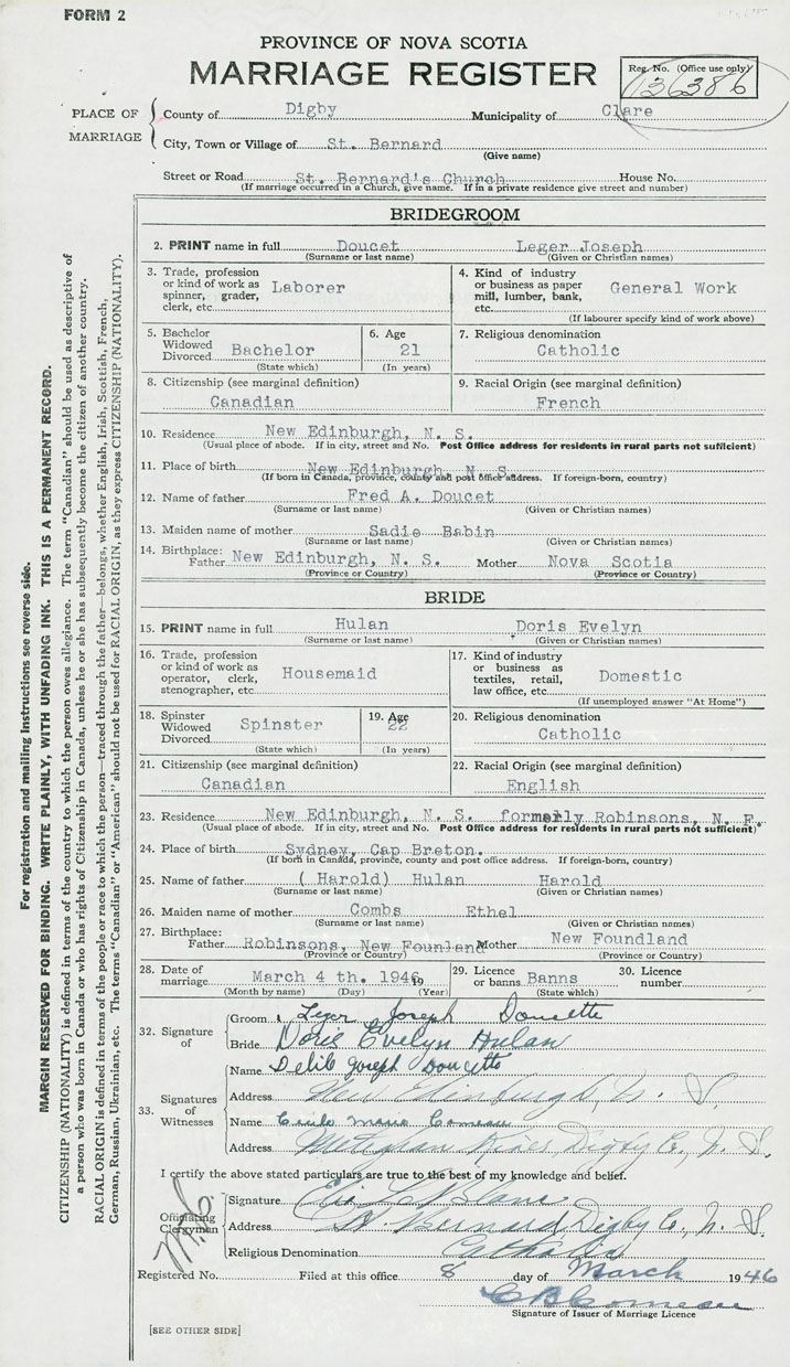 28. Date of marriage March 4 1946 29. By license or banns License 30. License number