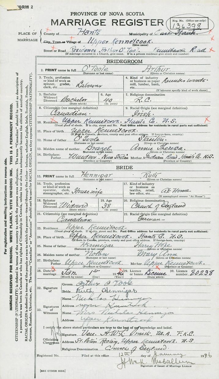 28. Date of marriage January 1 1946 29. By license or banns License 30. License number 80238