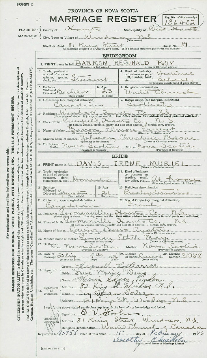 28. Date of marriage February 9 1946 29. By license or banns License 30. License number 80758