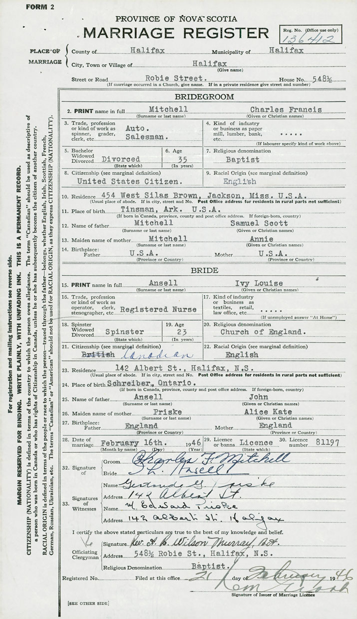 28. Date of marriage February 16 1946 29. By license or banns License 30. License number 81197
