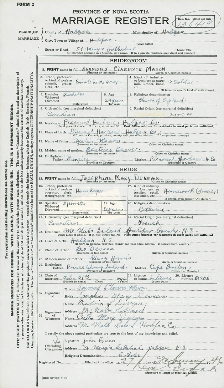 28. Date of marriage February 21 1946 29. By license or banns License 30. License number 81202