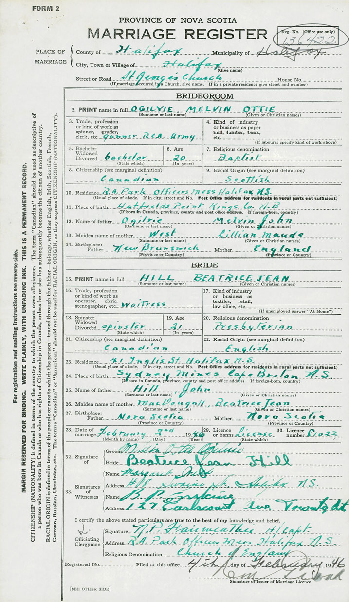 28. Date of marriage February 2 1946 29. By license or banns License 30. License number 81022