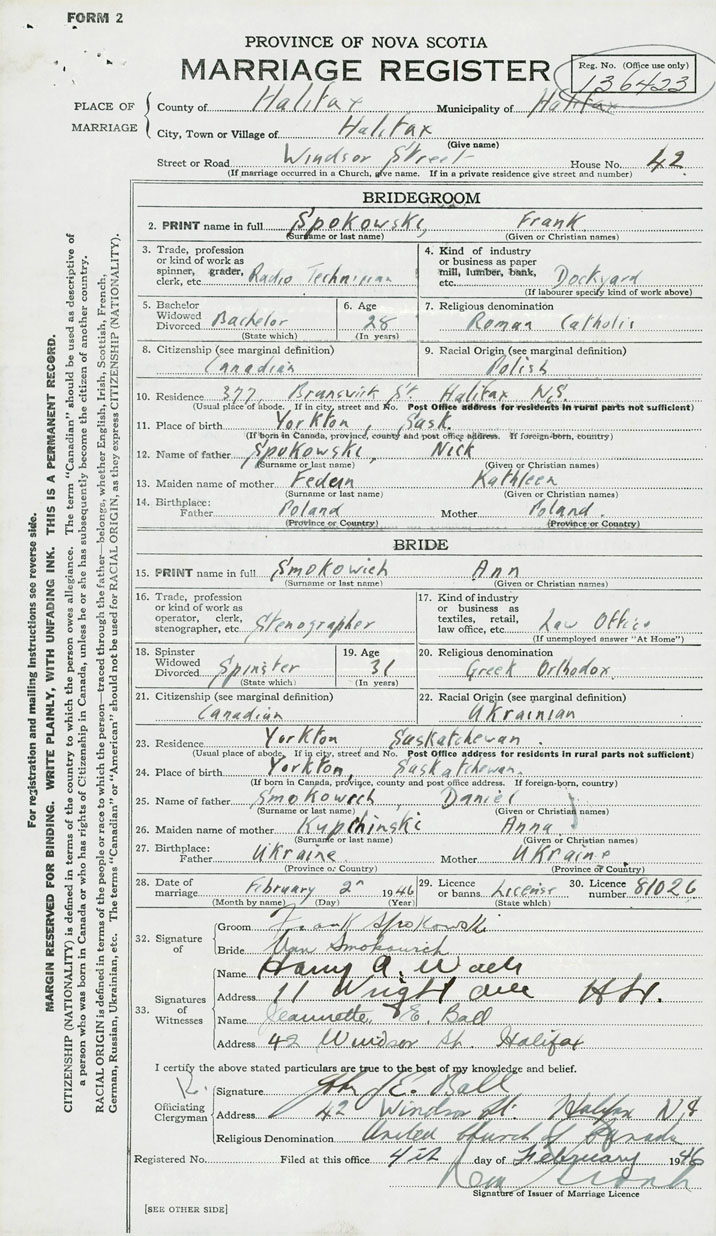 28. Date of marriage February 2 1946 29. By license or banns License 30. License number 81026