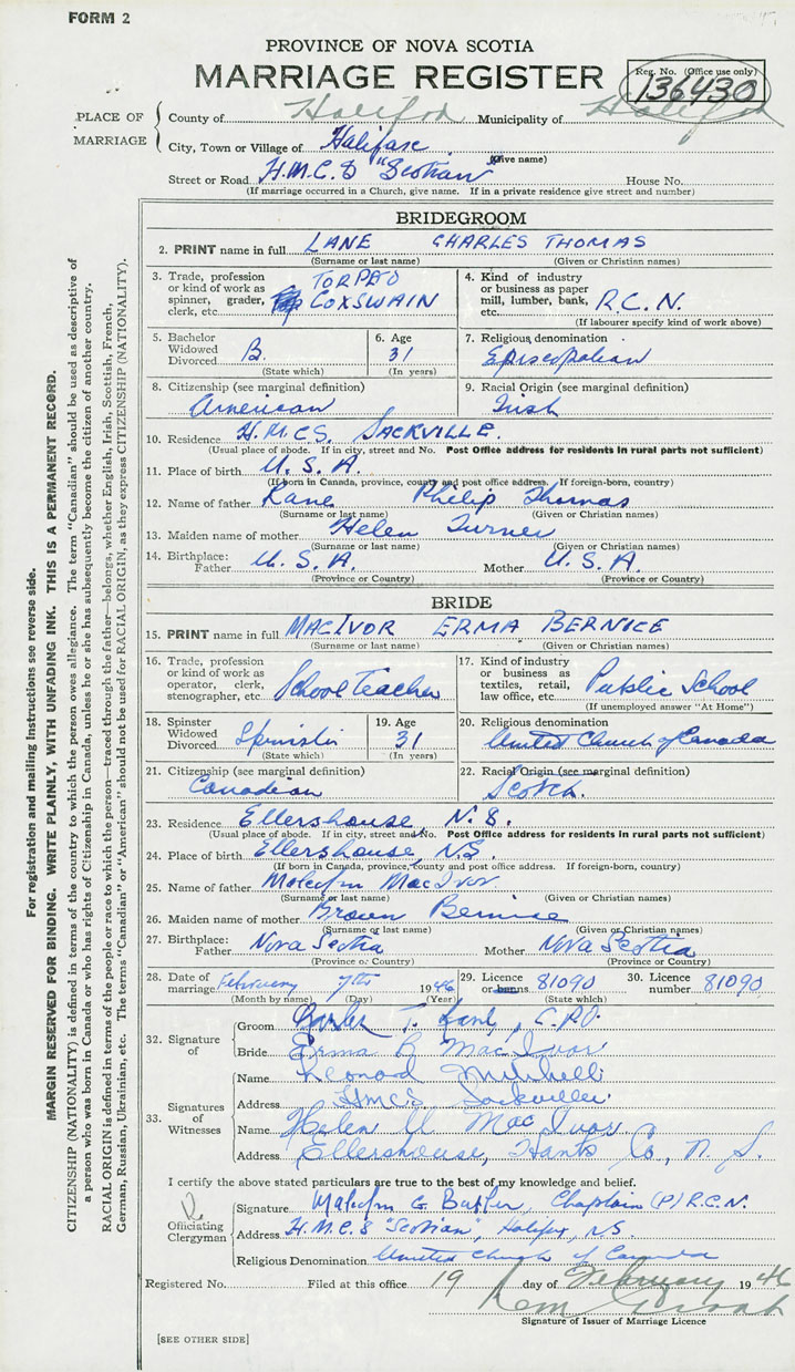 28. Date of marriage February 7 1946 29. By license or banns License 30. License number 81090