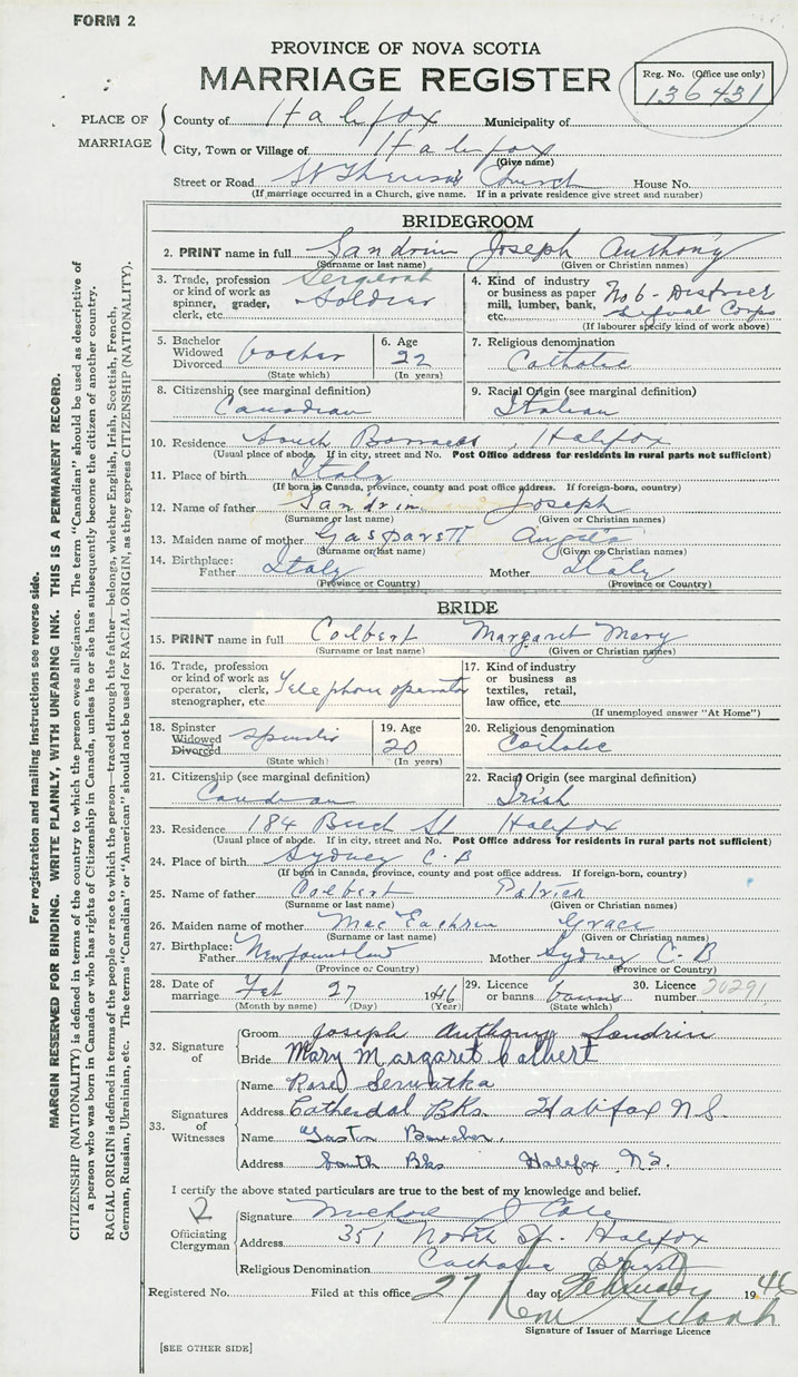 28. Date of marriage February 27 1946 29. By license or banns License 30. License number 20291