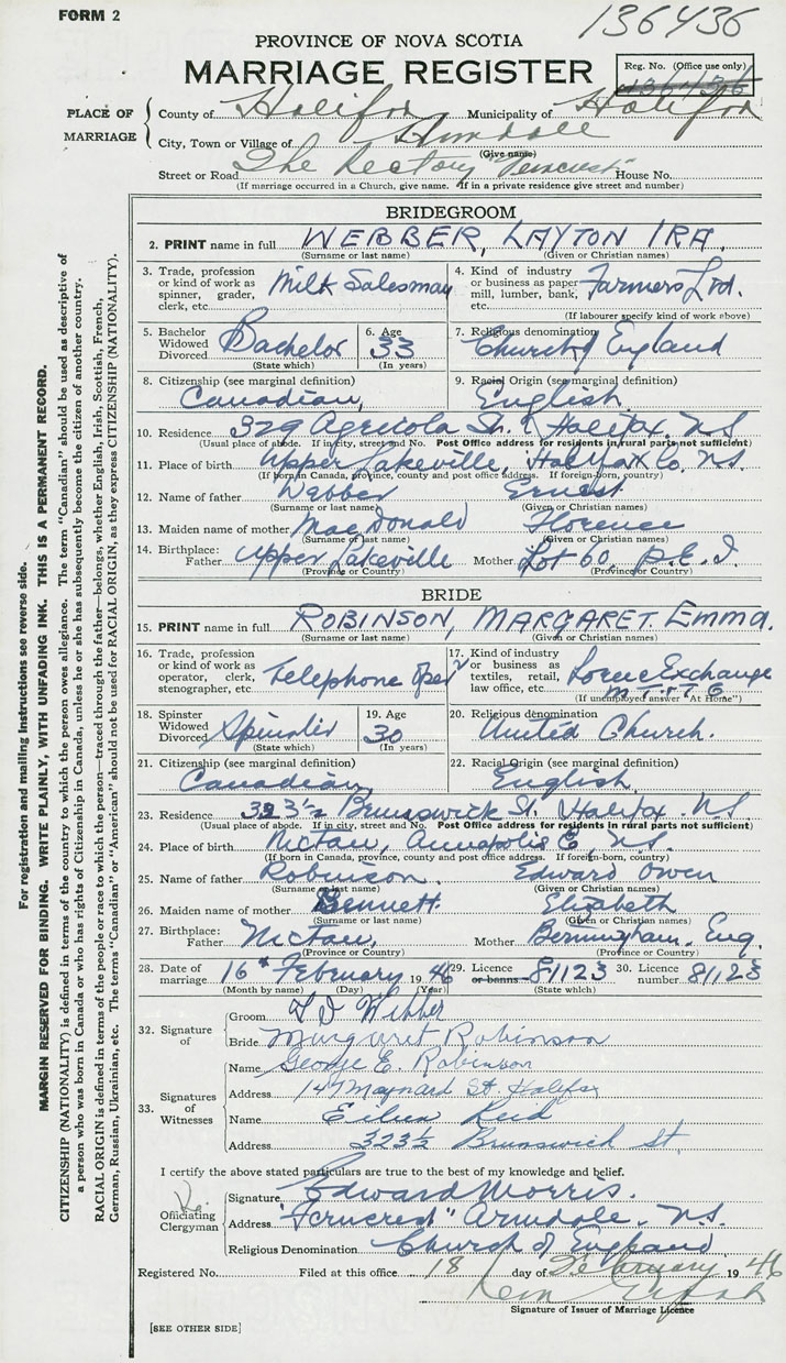 28. Date of marriage February 16 1946 29. By license or banns License 30. License number 81123