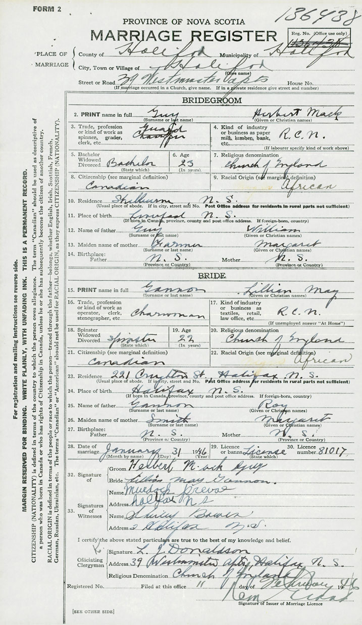 28. Date of marriage January 31 1946 29. By license or banns License 30. License number 81017