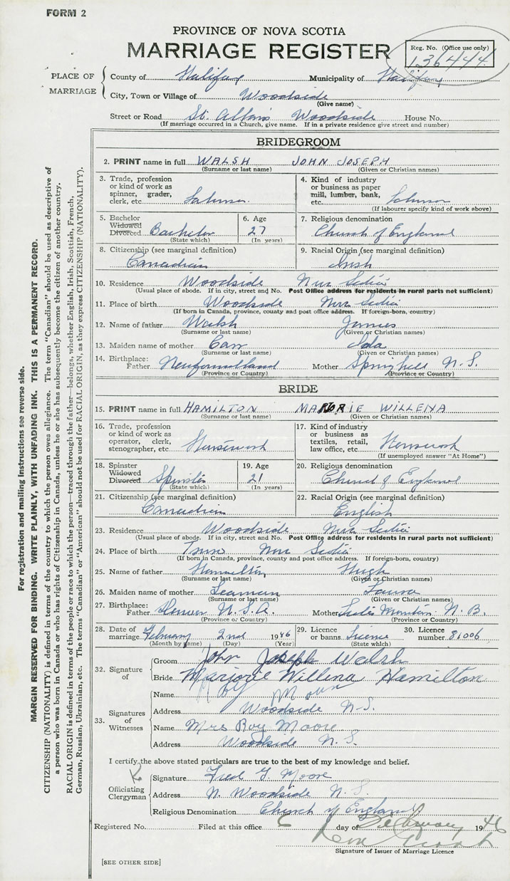28. Date of marriage February 2 1946 29. By license or banns License 30. License number 81006