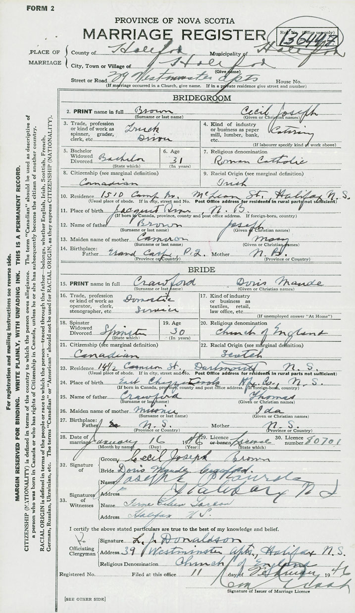 28. Date of marriage January 16 1946 29. By license or banns License 30. License number 80701