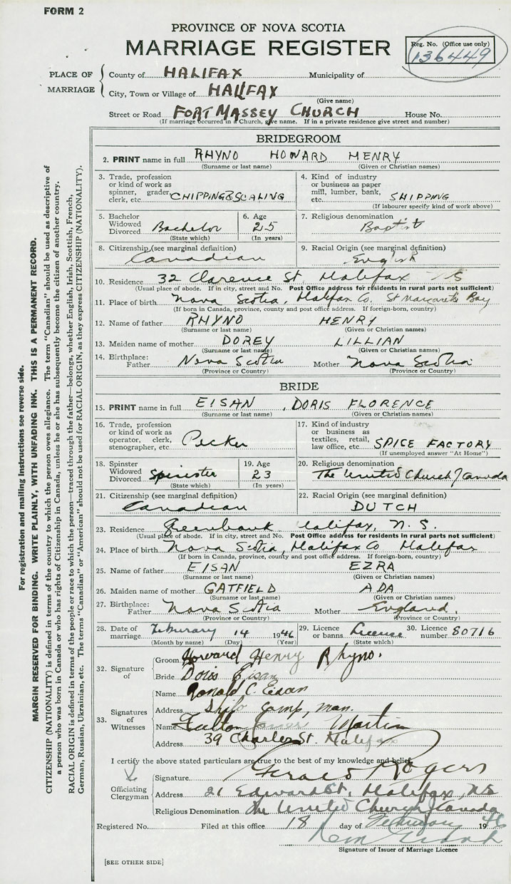 28. Date of marriage February 14 1946 29. By license or banns License 30. License number 80716