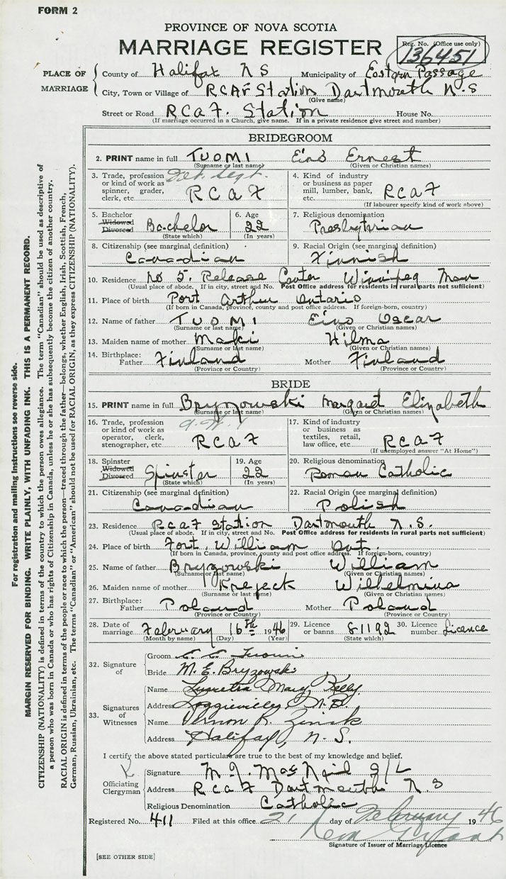 28. Date of marriage February 16 1946 29. By license or banns License 30. License number 81192
