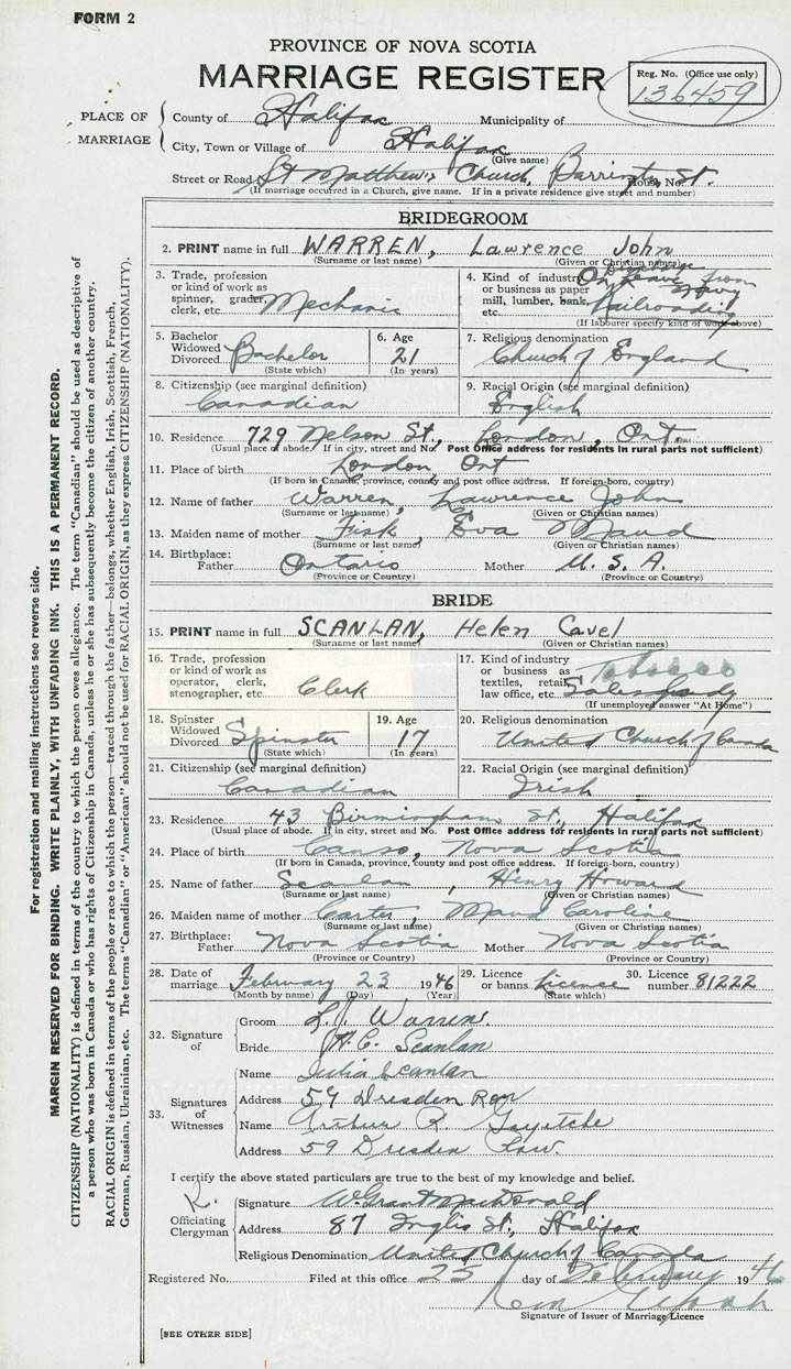 28. Date of marriage February 23 1946 29. By license or banns License 30. License number 81222