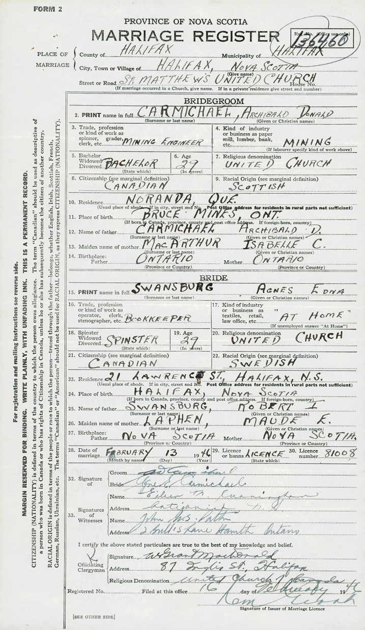 28. Date of marriage February 13 1946 29. By license or banns License 30. License number 81008