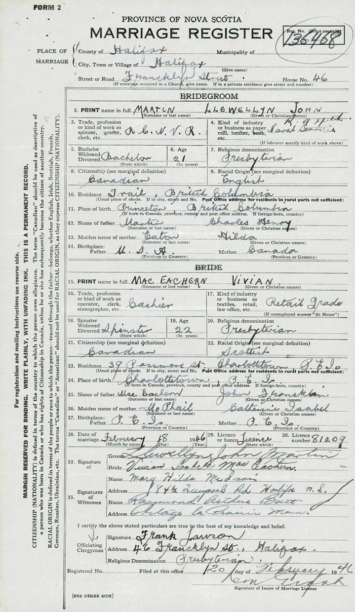 28. Date of marriage February 18 1946 29. By license or banns License 30. License number 81209