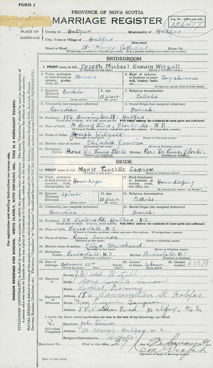 28. Date of marriage February 25 1946 29. By license or banns License 30. License number 20378