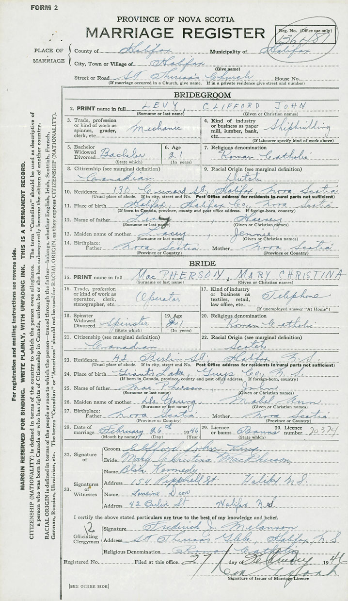 28. Date of marriage February 26 1946 29. By license or banns License 30. License number 20374