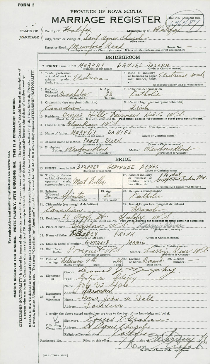 28. Date of marriage February 4 1946 29. By license or banns License 30. License number