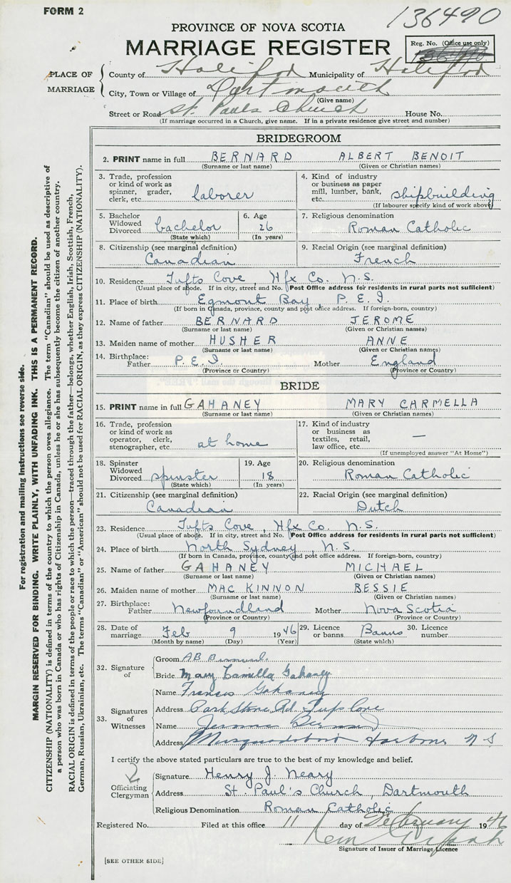 28. Date of marriage February 9 1946 29. By license or banns License 30. License number