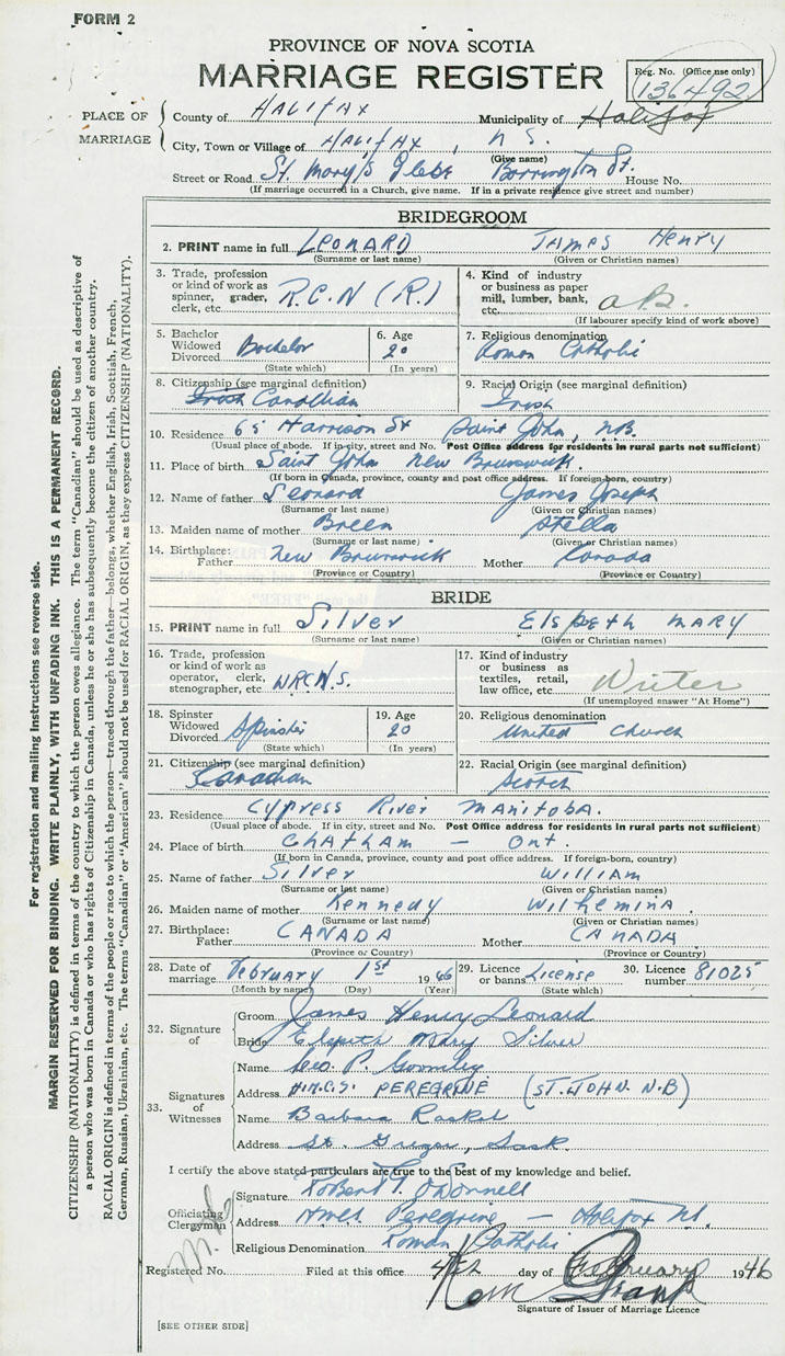28. Date of marriage February 1 1946 29. By license or banns License 30. License number 81025
