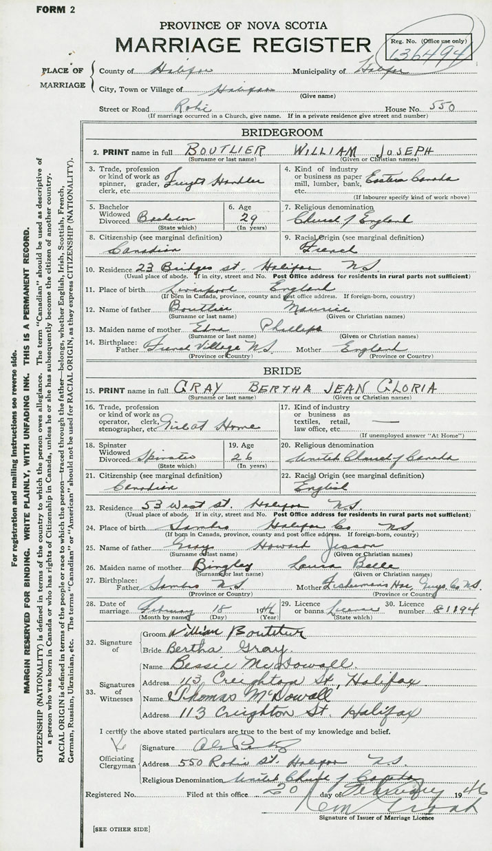 28. Date of marriage February 18 1946 29. By license or banns License 30. License number 81194