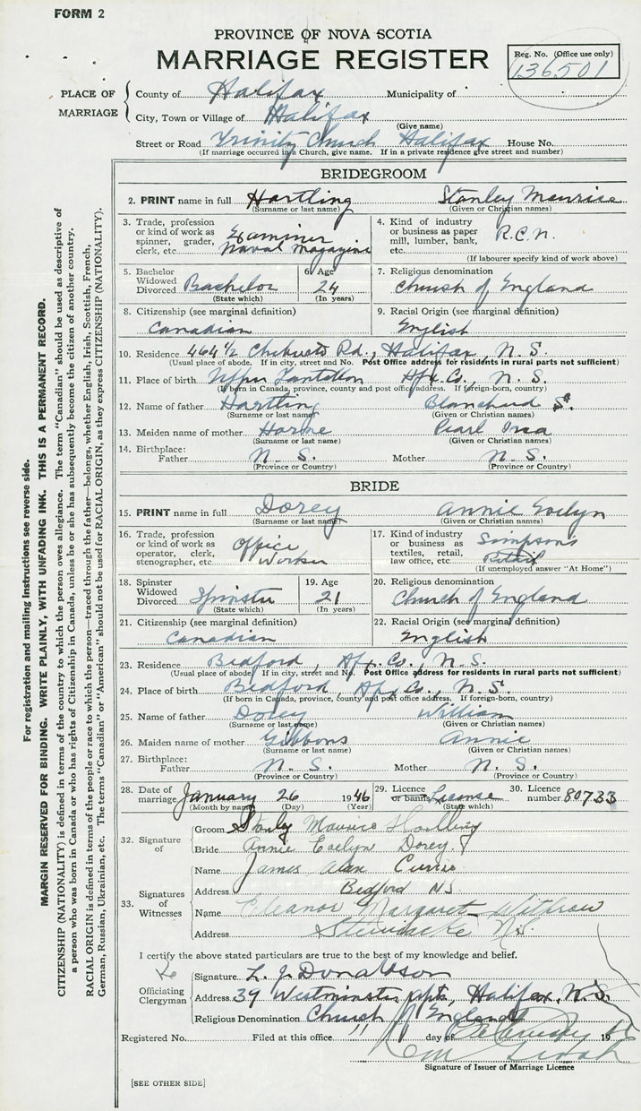 28. Date of marriage January 26 1946 29. By license or banns License 30. License number 80733