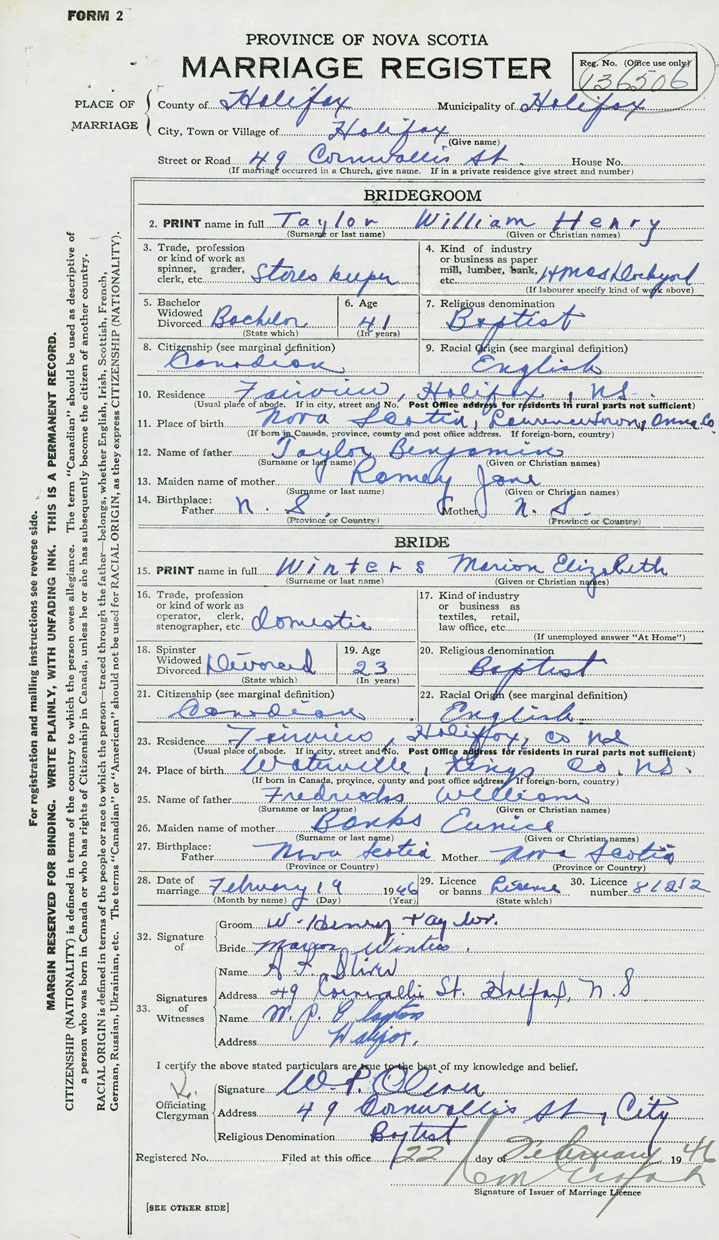 28. Date of marriage February 19 1946 29. By license or banns License 30. License number 81212