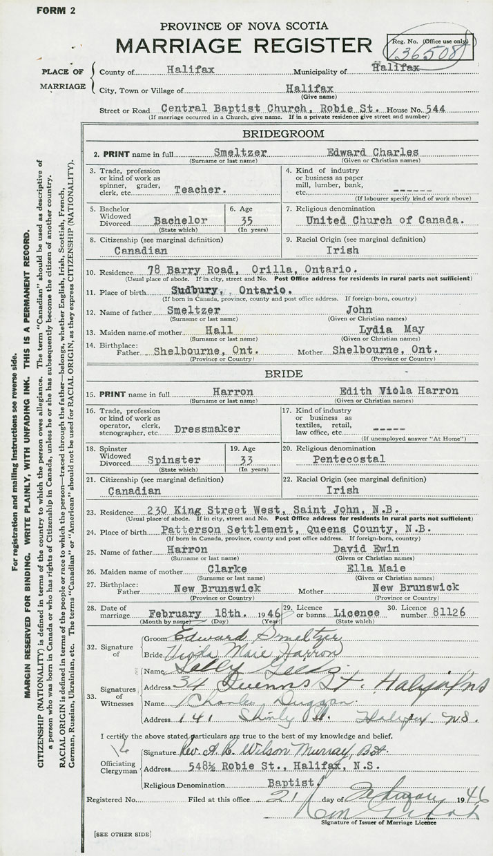 28. Date of marriage February 18 1946 29. By license or banns License 30. License number 81126