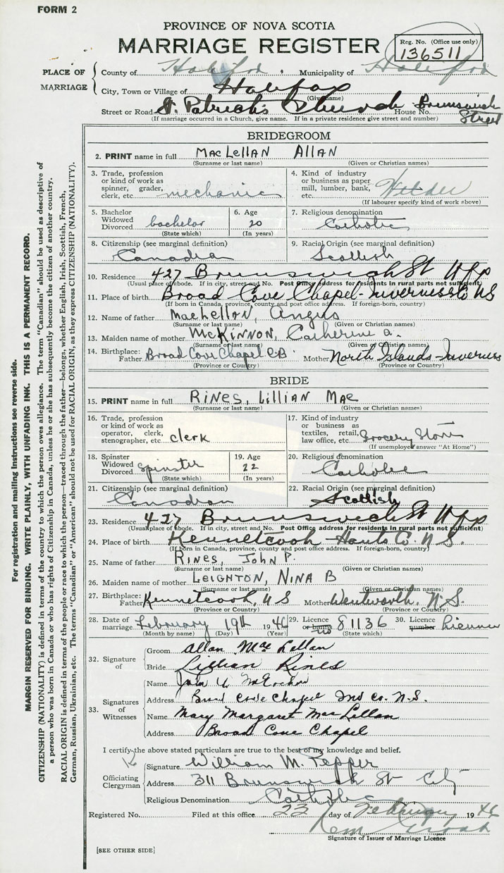 28. Date of marriage February 19 1946 29. By license or banns License 30. License number 81136