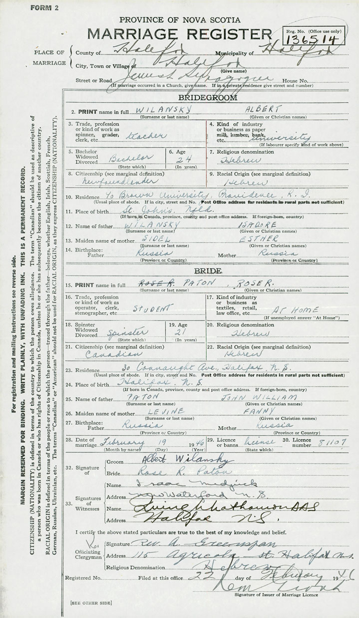 28. Date of marriage February 19 1946 29. By license or banns License 30. License number 81107