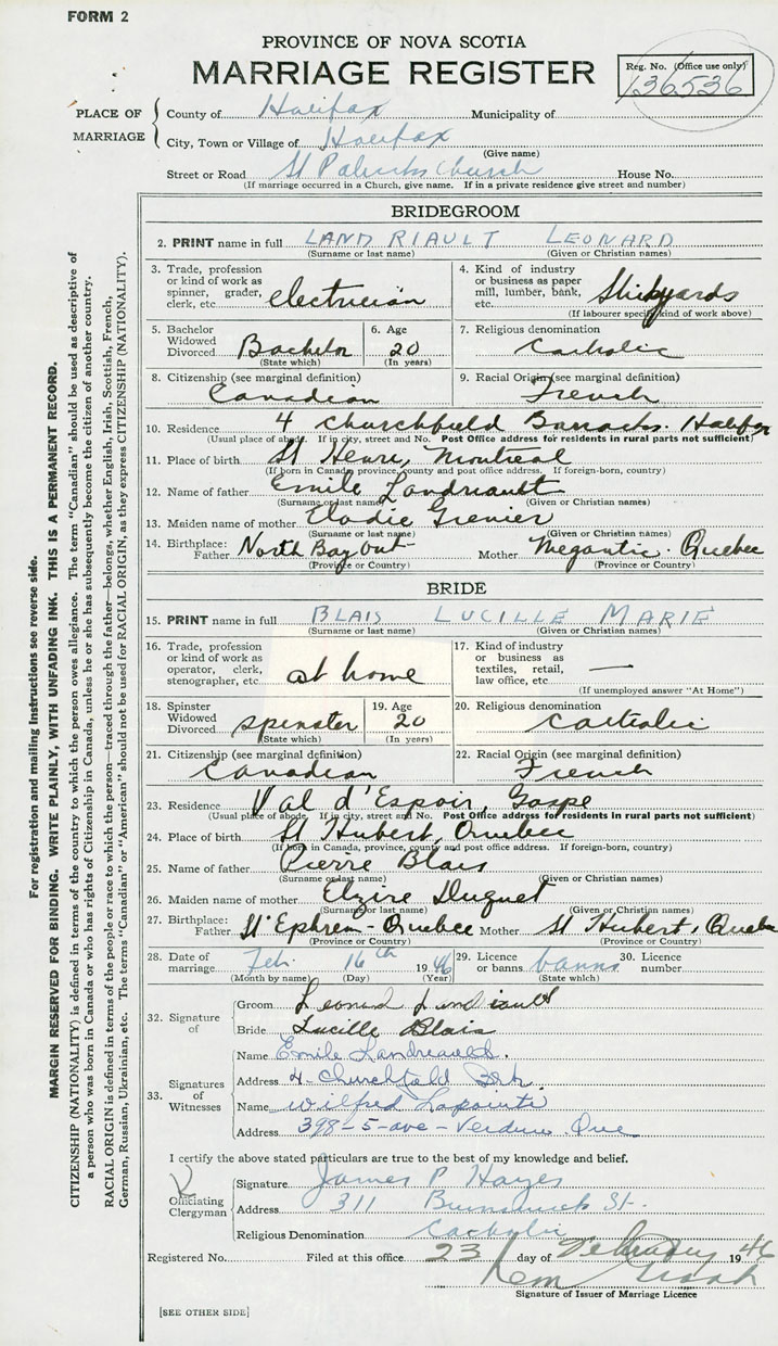 28. Date of marriage February 16 1946 29. By license or banns License 30. License number